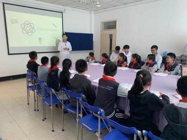 活动开始后,在大学生助教的引领下,同学们来到了化学实验楼会议室。老师幽默风趣的讲解使同学们在欢乐中知悉了实验室的安全注意事项及应急安全技能。学院为附校学生准备了专业的实验防护设备,依次做了PH值检验、苏打火山、热冰实验和黄金雨等4个实验,充分调动了附校学子学习科学的积极性,使他们体会到了科学世界的无穷魅力。四(6)班沈致远同学说:“我印象最深刻的实验是‘苏打火山’,实验成功后,老师告诉我们,是因为苏打遇到了食醋,酸碱中和而产生了二氧化碳气体,使得洗涤剂泡沫喷涌而出,我听了恍然大悟。这次走进大学的学习活动,不但锻炼了我的动手能力,而且还了解了生活中的化学。”