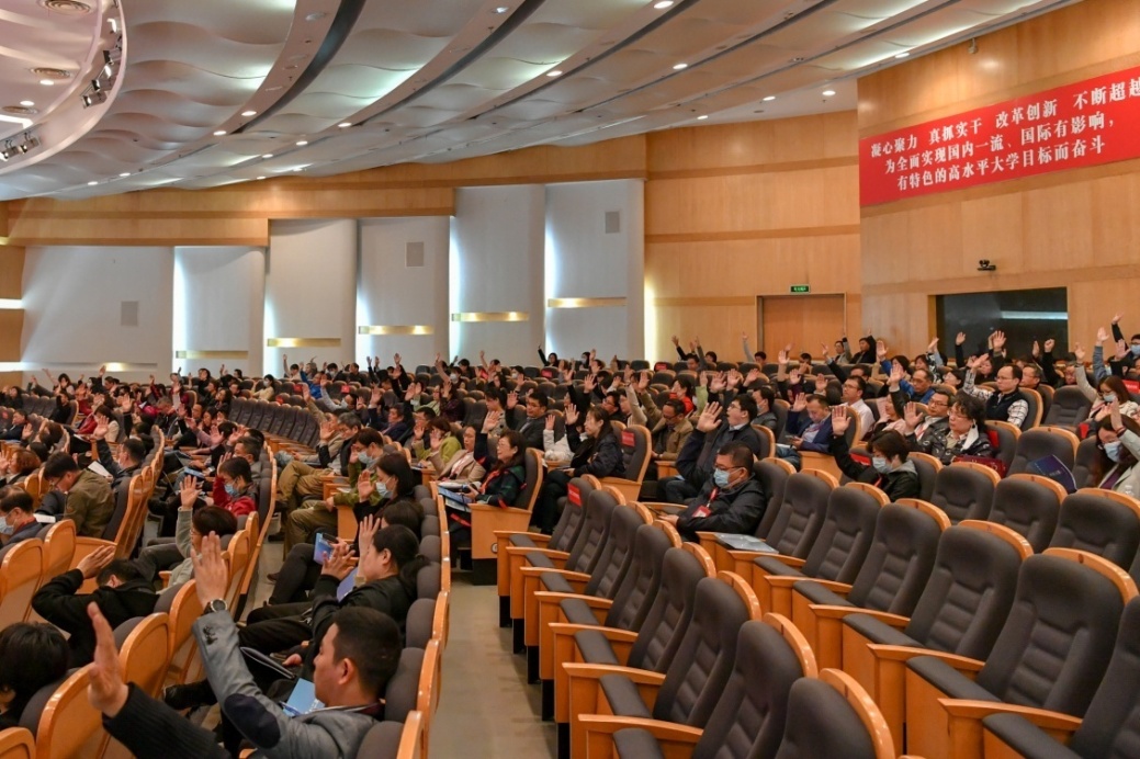 为回应广大代表对学校财务状况的关切,俞建勇向大会作学校财务状况分析专题报告,他系统介绍了学校财务状况及其关键问题,分析了问题形成的主要原因,指出了问题解决的突出困难,报告了学校已经采取的应对措施。他特别强调问题突破的关键举措,号召全体教职员工必须要坚持高质量发展、坚持改革创新、坚持系统观念,强化执行落实,齐心协力、奋进突破。